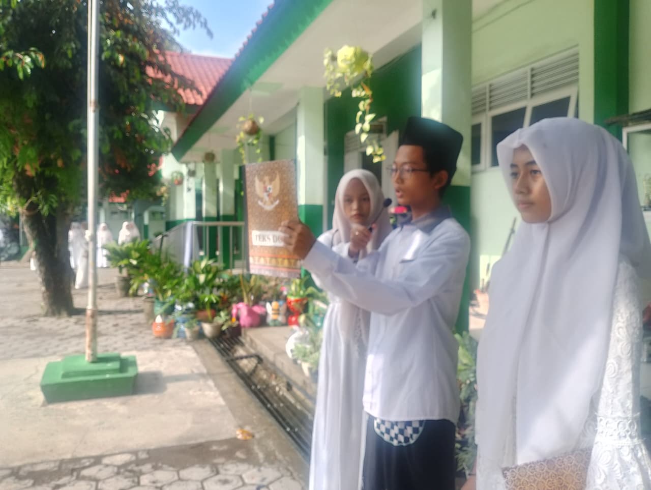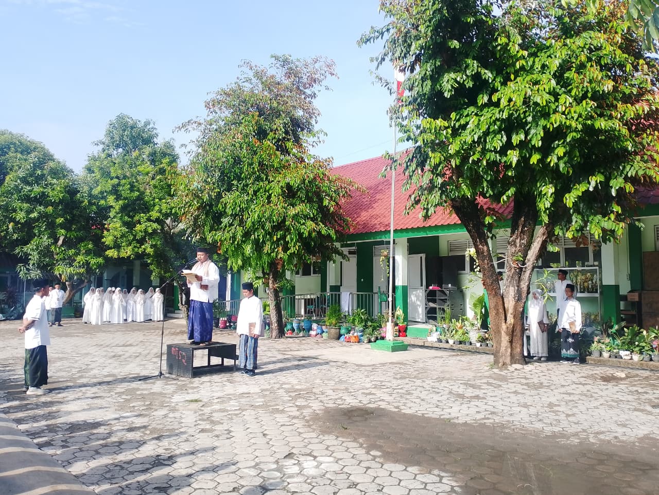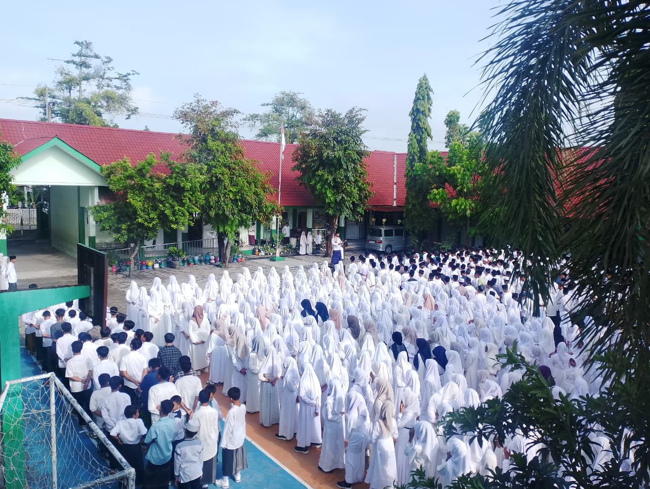 Apel dipimpin oleh Kepala Tata Usaha MTsN 2 Magetan, Muhtar Bisri, S.Ag., dan berlangsung dengan penuh khidmat. Dalam apel tersebut, peserta mengenakan busana khas santri, siswa laki-laki memakai koko putih, sarung, dan kopiah hitam, sedangkan siswa perempuan tampil anggun dengan gamis putih dan jilbab putih, menciptakan suasana religius dan penuh kebersamaan.