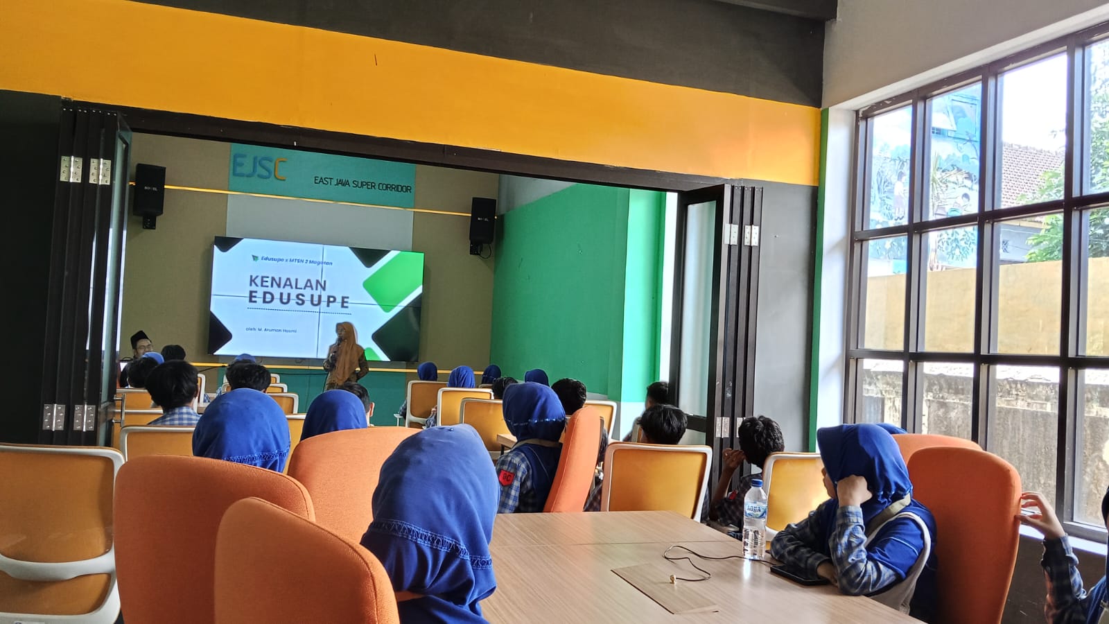Selanjutnya, di CV Edusupe, siswa mengikuti seminar dan diskusi interaktif yang membahas pemanfaatan teknologi informasi di dunia industri modern. Narasumber dari Edusupe berbagi pengalaman mengenai tantangan dunia kerja kreatif, serta pentingnya kemampuan adaptasi terhadap perkembangan teknologi digital. Sesi ini berlangsung di aula East Java Super Corridor (EJSC) Madiun dengan suasana yang inspiratif dan penuh semangat belajar.